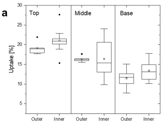 The results presented in Figure 2a show the variation in the liquid uptake along the height and across the stem diameter of the gmelina wood. The wood samples selected from the top position recorded a somewhat higher liquid uptake, while the differences in the uptake appear similar (not significantly different) between the outer and inner wood for the samples selected from the top, middle, and basal positions. Along the stem height, there is a significant difference in the uptake (as shown in Table 2), with the wood samples selected from the base having the lowest uptake. From the same table, it can also be observed that the percentage of the solution uptake is low among the two sample dimensions (small-sized and large-sized sample dimensions) impregnated. The effect of the sample dimension did not play any significant role in the solution uptake, as also observed in a previous study by Sint et al. [24]. The influence of the tree height on the uptake and permeability of liquids in wood has been discussed in previous studies; it plays a major role as the permeability increases from the base to the top [26,27]. According to Siau [28], permeability is defined as the measure of the ease with which fluids are transported through a porous solid under the influence of a pressure gradient, and it is affected by pore sizes and distributions, as well as the level of interconnectivity of the pores. From the above definition of permeability, it is expected that gmelina wood with its numerous pores should have little or no difficulty with the impregnation of water-based solutions.