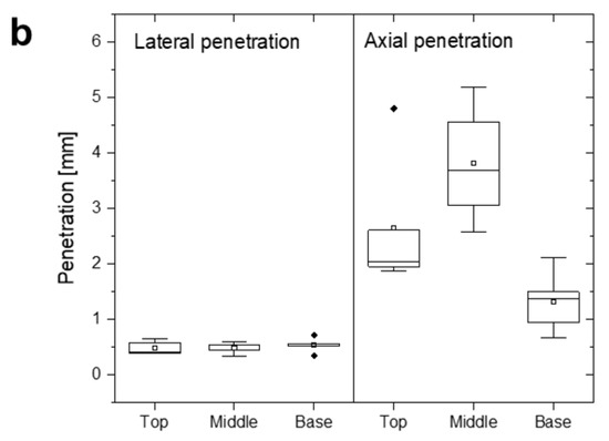 (a,b) Solution uptake and penetration depth of colored liquid in Gmelina arborea wood. The interpretation of the box plot is as follows: the centre line = the median, open square = the mean, box length = 25th to 75th percentile, whiskers 5th to 95th percentile, the black rhombus are the outliers.