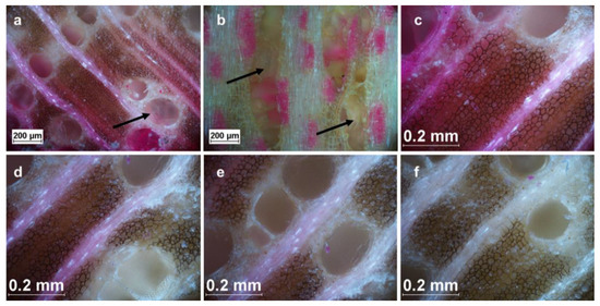 (a,b) Presence and abundance of tyloses (black arrows) in vessels revealed in cross-section and radial direction. Movement of colored liquid within a few micrometers from the edge of the sample and a discontinued penetration especially along the rays (c–f). Crystal-like substances are abundant in the rays, and movement of colored solution in the rays appeared to be discontinued due to crystal-like structure. Images in (c–f) were taken in sequence from the edge of the impregnated sample.