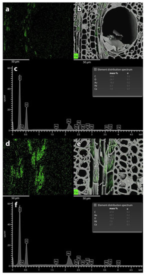 Further investigations into the nature of these crystals were carried out with scanning electron microscopy (SEM) and EDX. The measurements revealed the nature and composition of the crystals in the wood structure. As shown in Figure 4a–d, these crystals are needle-like structures and are abundant in the ray parenchyma cells of the gmelina wood. They were identified with EDX as calcium oxalate crystals (Figure 4e,f), and the ways in which they are distributed at the end of the ray parenchyma cells and also in the wood fibers showed that they may serve as blockages, leading to difficulties in the solution uptake in the axial and lateral directions. Another possibility of the effect of the calcium oxalate crystals on the difficulty in the impregnation of gmelina wood may arise from their non-solubility to polar liquids.