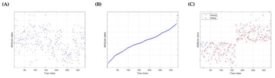 (A): The y axis depicts the values of the tree attribute (DBH, stem volume, DBH, or stem volume) used as target values. Here, the data are not in any specific order. (B): The values are sorted in increasing order. (C) The data are divided into two intervals, which are then shuffled internally. In every interval, a 50/50% testing-training split is made, which is depicted in blue and red. One fold of the two-fold cross-validation, which Panel (C) represents, then goes through both the intervals and picks the assigned testing-training samples for the prediction. This process is repeated twice, choosing different samples for testing and training to finish the two-fold cross-validation and capture all the values in the test set.