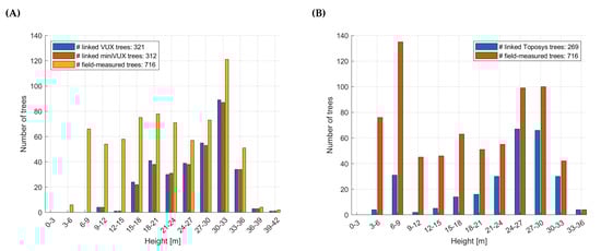 The number of ALS-derived trees after linking with the field-measured trees is illustrated in Figure 3. As Figure 3 shows, not all the trees are found in the point cloud data in the data-processing phase. The total percentage of ALS-derived trees increased from 37.6% of the Toposys data to 44.8% and 43.6% of the VUX and miniVUX data, respectively.