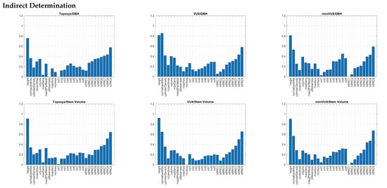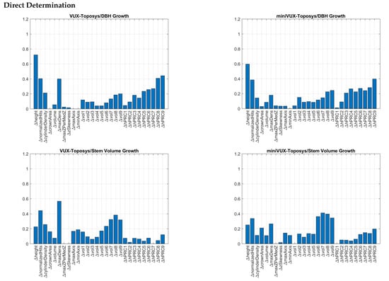 As the results suggest, metric-wise, the best results are produced by the direct determination, but the indirect determination produces better best-fit lines, even after applying the bias-fixing method. In most of the analyses, the densest VUX data perform best. This is not the case with the indirect stem volume growth determination, where all the metrics are in favour of miniVUX data. For height, DBH, and stem volume growth, the best values are 0.90, 0.48, and 0.45, with respective RMSE values of 22.4%, 35.2%, and 41.0%.