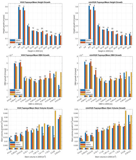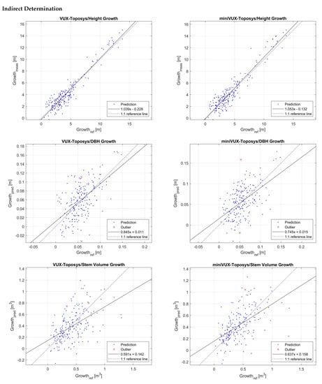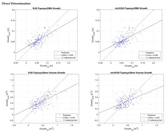 In the mean growth determination in Figure 8, the averaging process fades the under- and overestimation of growth values, which is due to bias in direct growth determination or noise in indirect growth determination. However, as the graphs show, a low number of values upon which the mean is calculated can lead to a deviation from the real value. An example of this is in the miniVUX-Toposys DBH mean growth determination, where there is one sample in the category of 0.5–0.55 m. The predicted indirect growth value is roughly eight times lower than the reference value. The values of mean height growth determination do not suffer from this, as the individual predictions are much more accurate.