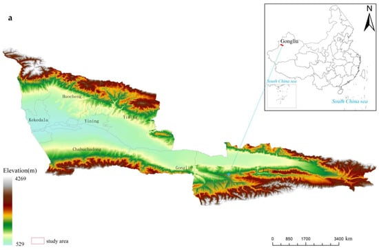 The study area is in the Gilgalang River Dazhuolesay Gorge, Mohe Township, Gongliu County, Ili, Xinjiang. Geographical coordinates: longitude 82°43′–82°52″ E, latitude 43°10′–43°14″ N. The ditch is 4.5 km north–south and 1.1 km east–west, covering an area of 18,000 ha (Figure 1), and is a typical region of the distribution of the Malus sieversii forest in China []. The study area is dominated by low hills and mountains of the geomorphic type, with the terrain being high in the south and low in the north, sloping from east to west, with an elevation of 1100–1600 m. Northern temperate continental arid climate with an average annual temperature of 7.4 °C, a frost-free period of 145 days, 280 mm of precipitation and inverse temperature phenomenon in winter []. The study area has the most robust inversion layer cover and more stable climatic characteristics []. The soil is dark brown with a deep loess mother material []. The distribution of vegetation is characterized by a mixture of typical mountain steppes, meadow steppes, and wild fruit forests. The wild fruit forests are mainly found on shady and semi-shady slopes [], with the understory forming a multi-level community structure of trees, shrubs and grasses [].