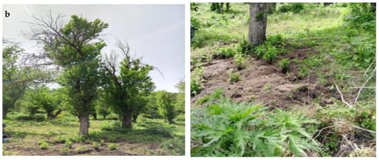 The location of the study area and sampling points. (a) Locations of sampling sites; (b) General view of wild apple forests; (c) Distribution of Malus sieversii root sprouts under the tree canopy.