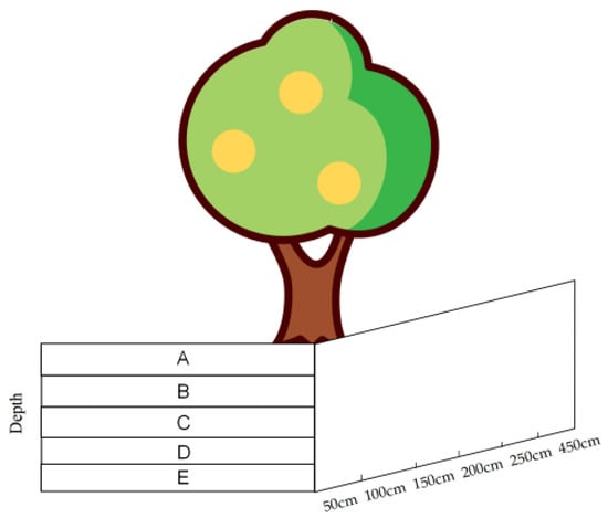 Root survey sample. (A–E represent the depth of root burial in five profiles, respectively: <5 cm, 6–20 cm, 21–40 cm, 40–60 cm, and >60 cm.)