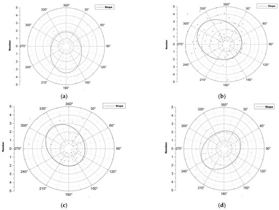 Spatial distribution of root sprouts of Malus sieversii on different slopes. (a) Spatial distribution direction of eastern slope root sprouts; (b) Spatial distribution direction of western slope root sprouts; (c) Spatial distribution direction of western slope root sprouts; (d) Spatial distribution direction of northern slope root sprouts.