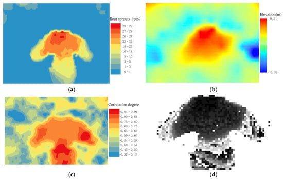 The root sprouts exhibited natural growth characteristics around the parent plant (Figure 1d). Spatial analysis algorithms at the global scale could not detect topographic correlations between root sprout distribution and topography. The application of association rule mining algorithms in a spatially heterogeneous environment can effectively obtain local distribution characteristics of spatial correlations []. Grey correlation analysis is widely used to quantify the degree of association between factors and has proven to be a feasible method []. Therefore, this paper uses grey correlation analysis to analyze the spatial distribution of root sprouts and topographic correlation characteristics.