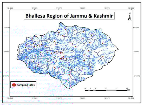 For inventorying different plant species (higher plants), twenty-four field exploration surveys were carried out from 2018 to 2021 in different growing seasons in the Bhallesa region of the Pir Panjal mountain range. At the onset, the study area was divided into four sub-sites (Chilli, Kahal, Chanwariand Gandoh), and at each site, 25 replicated plots (each measuring 2500 m2, 50 × 50 m2) were established and further divided into plots of 10 × 10 m for convenience. In order to reduce the effects of spatial autocorrelation, the least distance between the plot ranges was maintained between 500 and 100 m, depending on the geography of the site chosen for surveying and studying. Altogether, 100 plots measuring 250,000 m2 (or 250 km2), randomly placed quadrats, were studied to document the entire floristic wealth of Bhallesa. The unapproachable sites and tough mountainous terrains were excluded from laying the quadrat study. The multiple surveys were carried out to account for plant species-specific variations with timing and the duration of fruiting [92] within each sampling plot between 2018 and 2021. Each selected plot was visited six times per year in February, April, June, July, September and November (totalling 24 field tours, covering 119 days).