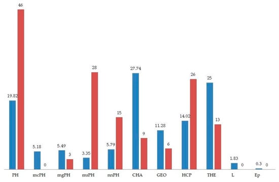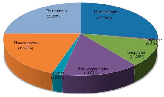 The biological spectra of Bhallesa Hills show chamaephytes as the most dominant group, representing a total of 27.74% (91 taxa), followed by therophytes having 82 taxa (25%), 65 phanerophytes (19.82%), 46 hemicryptophytes (14.02%) and 37 geophytes (11.28%) (Figure 2). Lianas (6 taxa, 1.83%) and epiphytes (1 taxon, 0.3%) represent the lowest life forms of coniferous forests of the Bhallesa region. Among the phanerophytes, the nanophanerophytes (nnPH), represented by 19 taxa (29.23%), were more dominant than the megaphanerophytes (mgPH) comprising 18 taxa (27.69%), microphanerophytes (mcPH) comprising 17 taxa (26.15%) and mesophanerophytes (msPH) with 11 taxa (16.92%) (Figure 3, Table 4). The chamaephytes, followed by the therophytes growing in the Bhallesa regions, show a maximal divergence from Raunkiaer’s normal spectra. An increase in the number of phanerophytes and therophytes shows that the community has a warmer climate [125,126], whereas the chameophytes and hemicryptophytes were confined to the cold regions. The biotic and abiotic disturbances in a particular area tend to increase the number of therophytes in the area. A study carried out by Deljouei et al. [127] in the temperate hornbeam-beech forests of Northern Iran recorded hemicryptophytes (54.8%) as the dominant biological spectrum group, followed by the cryptophytes (25.8%), therophytes (11.3%), phanerophytes (4.8%), and chamaephytes (3.3%). Furthermore, the diversity index of different species decreases when the distance of disturbance increases; this decreasing trend continued up to 60m from the forest road margin, and after this threshold, the index slightly increased.