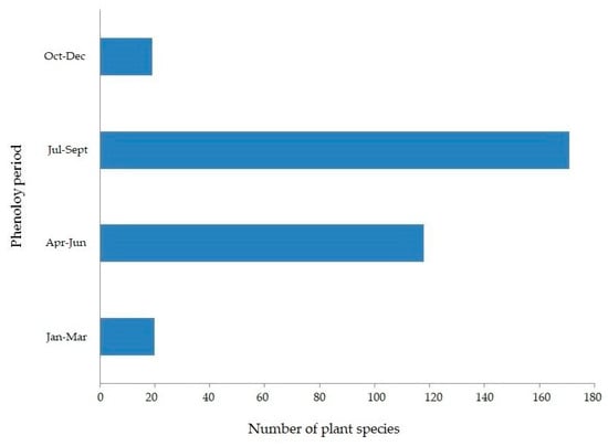 The flowering periods of the plant specimens collected from the study area were categorised into four different groups. From January to March, a total number of 20 species were recorded in the flowering stage (6.10%), followed by 118 taxa observed flowering in April to June (35.98%), 171 taxa in July to September (52.13%), and only 19 taxa were seen flowering from October to December (5.79%) (Figure 4). It has been observed that the species growing in the Bhallesa mountain area prefer flowering between July and September, as most of the study regions fall under the temperate zone, which experiences extreme snowfall in the winter season. The plants growing in the region flourish by making their penetrating buds dormant to overcome harsh conditions. Due to this, the plants growing in various habitats mostly bloom in the summer and spring seasons. From July to September, the study area received the maximum of its rainfall; therefore, the high rain allowed the plants to bloom and grow. Several studies, which were undertaken in the past on phenology and the discovery of new plants in the last fifty years, supported the quantitative and phonological studies, better providing a clear picture of the vegetation composition of the area [142]. Kala [143] studied the phenology of sub-aline and alpine plants in the Valley of Flowers National Park and Hemkund, situated in Uttarakhand (Western Himalaya), and recorded April as the month of a favourable growing season, and seed dehiscence was completed from September to October. Another study, undertaken by Pangtey et al. [144], recorded the various developmental stages of 148 species of high-altitude regions of the Pindari glacial moraine area of Kumaun of Central Himalaya (India), concluding that most of the plants on high hills and valleys complete their growth cycles within a short period of favourable conditions to ensure the survival of their progeny—the June to October months are the peak phenophase period. Furthermore, this finding of our study shows similar patterns to the existing studies carried out in mountainous regions by several various other researchers across the globe [145].
