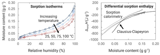 Direct enthalpy measurements of water sorption in wood by calorimetry are scarce in the literature [6,15,87,88], and most enthalpy values of water sorption in wood are derived from the Clausius-Clapeyron equation [89,90,91,92]. However, the development of sorption calorimetry [93,94,95] in the last two decades provides new opportunities for direct measurements that could improve our understanding of wood-water interactions [84], not only for native wood but also for modified wood of various kinds.