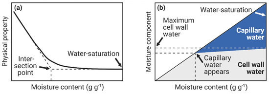 Many different methods have been used to determine FSP. Each of these methods contains implicit assumptions about what the FSP is since the definition is not consistent. Tiemann based his FSP of observations on the strength of wood. However, many wood properties exhibit a change in behavior around a given moisture content. Researchers have determined the FSP from strength or stiffness [4,118], dimensional changes [119,120], and electrical conductivity [121,122,123]. These techniques focused on the part of Tiemann’s definition, which describes a change in property. Hence, in these studies, the FSP was identified as the moisture content at the intersection point between the moisture content range in which the physical property changes and the range in which it is constant, as illustrated in Figure 4a.