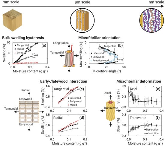 Multiple phenomena involved in the swelling of wood from macro-scale to nano-scale. On the macro-scale, bulk wood exhibits swelling hysteresis (a) which results in differences in dimensions at similar moisture contents depending on moisture history (arrows show sorption direction). On the micro-scale, the dominant microfibrillar orientation (b), i.e., the microfibril angle, affects the swelling in different directions of the cell (illustrated by the tangential and longitudinal swelling), and the interaction between earlywood tissue and stiffer latewood tissue affects the swelling in the tangential (c) and radial (d) directions. On the nano-scale, swelling stresses arising from changes in moisture content cause deformation of the cellulose microfibrils in the axial (e) and transverse (f) directions. Experimental data: (a) spruce [146], (b) Radiata pine [147], (c,d) Norway spruce [148], (e,f) Norway spruce [144]. Note that swelling data in (b) are calculated from data for the total shrinkage from green to oven-dry conditions, whereas swelling data in (c,d) are reported relative to the dimensions in equilibrium with 25% RH and not to those in the dry state.