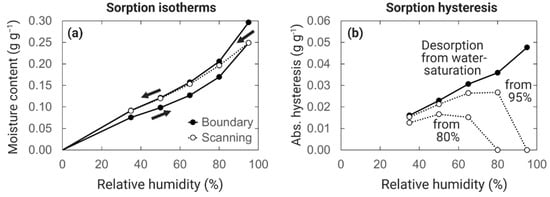 (a) Moisture sorption isotherms, and (b) absolute hysteresis curves for wood of Norway spruce [174]. Desorption isotherms are determined either from full water saturation (boundary curves) or from conditioning in absorption to either 95% or 80% RH (scanning desorption).