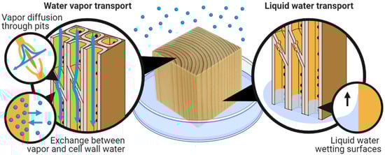 Water in wood can be present both within cell walls and in the porous, macro-void structure of the material, as depicted in Figure 1. Within cell walls, water molecules are commonly referred to as “cell wall water” or “bound water” as they closely interact with the cell wall polymers. Water in the macro-void structure is called “capillary water” or “free water” and interacts with wood through surface forces. Although “free water” is often used in the literature, this term is misleading because capillary water is constrained within and interacts with the wood structure albeit by other mechanisms than cell wall water [26]. The following sections discuss the state and location of water within cell walls and the macro-void structure of wood.