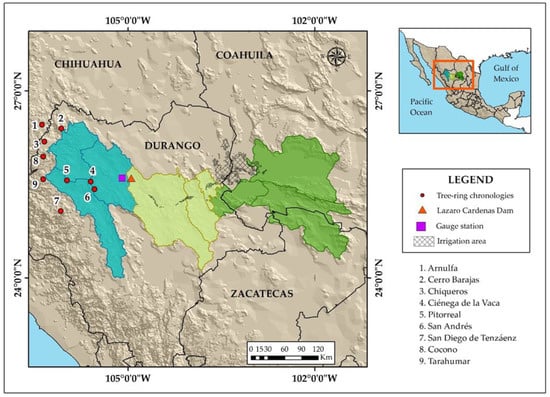 An assemblage of tree-ring chronologies for the Nazas (NZW) in the Western Sierra Madre (WSM), Mexico was developed to determine water inflow at the Lazaro Cardenas Dam (LCD), the main source of water for surface irrigation in the Irrigation District 017 (DDR 017), Comarca Lagunera. A Principal Component Analysis of the ring-width chronologies was conducted to determine a common climate signal, and a stepwise model based on selected chronologies of the PC1 (CBA, COC) and PC2 (ARN) were used to develop a water inflow reconstruction to the Lazaro Cardenas Dam (LCD) extending from 1753 to 2003 (251 years), resulting in the following significant findings: the warm phase of the El Niño Southern Oscillation (ENSO) in the winter-spring season had a significant influence (SOI; Dec–Feb = −0.24, p < 0.01), but the North American Monsoon System (NAMS) was the most important in determining the water yield in the summer season (r = 0.48, p < 0.01). Water gauge inflow records (77 years) at the LCD used to determine the annual allocation of water for agriculture in the irrigation district 017 was an average of 1676 × 106 m3, where the maximum annual water outflow allowed of 1100 × 106 m3 for safety reasons, the dam infrastructure was released in 74% of the years and increasing to 78% when considering the reconstructed inflow. Prolonged drought episodes lasting more than 10 consecutive years were detected in the reconstructed inflow, information that could be used by decision makers to establish proper irrigation management strategies to ameliorate the economic and social impact when these extreme hydroclimatic events may occur.