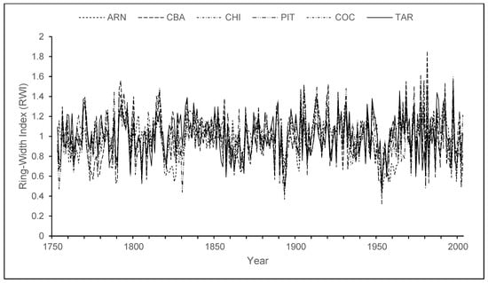 The ring-width chronologies explaining greater variance in PC1 were COC, CHI, PIT, and CBA, whereas in PC2 was ARN (Figure 4).