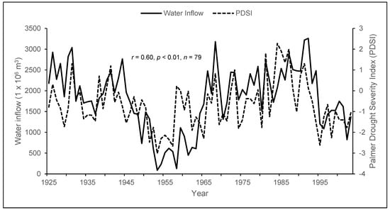 Relationship between the reconstructed water inflow to the LCD and reconstructed June–August PDSI values for the Nazas watershed [].