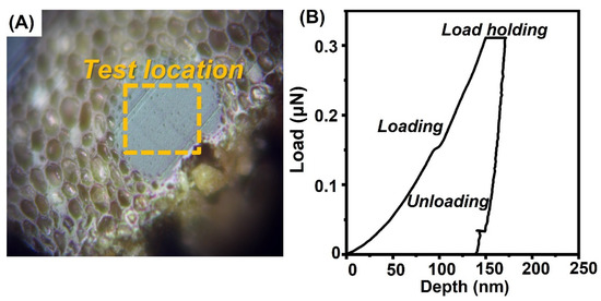 Bamboo cell wall test location during the nanoindentation test (A) and typical load-depth nanoindentation curves (B).