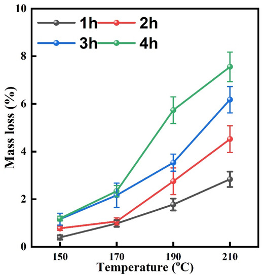 Figure 5 shows the mass loss of the different bamboo specimens. As shown in Figure 5, the mass loss positively corresponded to the treatment severity. However, no significant difference can be observed between groups under 150 °C. With the increasing severity of treatment parameters, the mass loss ratio exhibited the highest value (7.8%) when the treatment parameters were set at 210 °C and 4 h, which was determined by the chemical composition. After the heat treatment, the main chemical compositions decreased, and thus the mass was lower than those of the control [28].