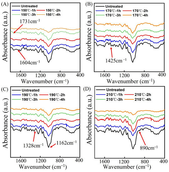 Fourier-transform infrared spectroscopy (FTIR) was used to investigate the effect of thermal modification on the chemical functional groups in bamboo. The FTIR curves of untreated and treated bamboo specimens from 500 cm−1 to 4500 cm−1 are shown in Figure 6. The spectra of bamboo present the typical peaks of bamboo: 1731 cm−1 (C=O strength vibrations of hemicellulose), 1230 cm−1 (C-O strength vibration peaks), 1590 cm−1 (stretching of carboxylic acid), 1425 cm−1 (strengthening of acetyl acid). It can be seen from Figure 7 that there was no significant difference in the FTIR spectra between untreated and treated bamboo specimens. The relative intensity of the peak at 1370 cm−1 did not change too much due to the stability of C-H, indicating that C-H remains unchanged during the thermal modification. The relative intensities of the peaks at 1230 cm−1 and 1730 cm−1 showed a decreasing trend in comparison to those of untreated bamboo samples, which can be attributed to the decomposition of the cellulose and hemicellulose in bamboo samples. During the heat treatment process, the relative intensities of the peaks at 1630 cm−1 and 1590 cm−1 increased with the increase of the treatment temperature. This can be attributed to the increase in lignin content. The condensation reaction of lignin contributes to the increase in relative lignin content and enhances the dimensional stability of bamboo specimens. Lastly, the relative intensity of the peak at 898 cm−1 obviously decreases, which possibly results from the acid environment provided by the decomposition of hemicellulose.
