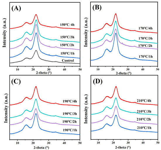 The method reported by NERL’S LAPs was applied for the determination of cellulose, hemicellulose, and lignin in bamboo. Table 1 shows the chemical compositions of the different bamboo specimens. The difference between the relative content of the main chemical composition was not too obvious when the bamboo sample was treated at 150 °C. Therefore, these results confirmed the previous literature that reported on thermal modification above 150 °C. Namely, the increment of treatment parameters induce negative effects on hemicellulose and cellulose content. Table 1 shows that hemicellulose and cellulose content decreased to 16.6% and 43.6% after 210 °C/4 h treatment. The lignin content increased from 29.0% to 36.1%. This is due to lignin recondensation [28,29,30]. Accordingly, the lignin increased from 28.7 (control) to 36.1% (210 °C/4 h), which is a co 24.9% increment, indicating that the increment of treatment temperature further promoted the decomposition of hemicellulose’s by-products. According to the previous literature [31], lignin condensation can also contribute to the incrementation of lignin content. Among the structural units of lignin, the carbon atom of the side chain of one lignin molecule is C-linked with the carbon atom of the benzene ring of another structural unit, thus forming the lignin condensation with large molecular weight [32]. As a result, the lignin becomes difficult to degrade and the lignin content increases. The results from the changes in chemical components confirmed the observation of mass loss [33].