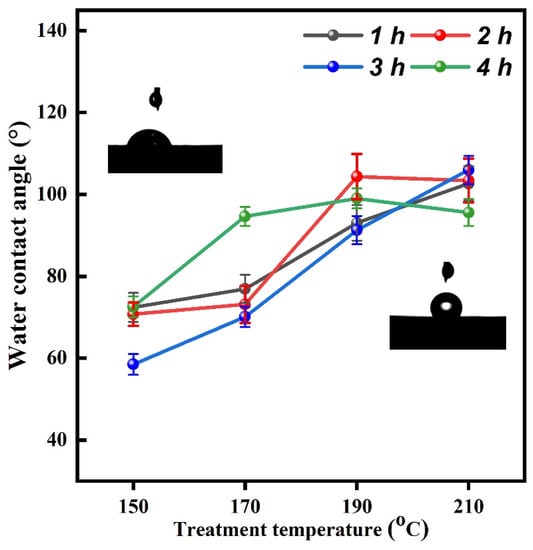The water contact angle of the bamboo surface is an important property for outdoor bamboo applications, which is determined by its chemical composition change. The surface hydrophobicity of thermally modified Moso bamboo was characterized by a contact angle test. Figure 9 presents the contact angle of untreated bamboo specimens as 48.5°. After nitrogen thermal modification, the contact angle of the treated bamboo specimens increased from 48.5° (control) to 105.3° (170 °C/3 h). These results may be attributed to the decomposition of a free hydroxyl group (-OH), which is mainly existed in hemicellulose. During the heat treatment process, the force between hydroxyl groups and hemicellulose weaken, thus the hydroxyl group decreased. The increment of water contact angle value represented the increment of bamboo surface hydrophobicity, it can be attributed to the thermal modification. For detail, dense bamboo cell walls with low surface energy is formed on the heat-treated bamboo samples [35,36]. Meanwhile, the lignin is proved to increase in the bamboo surface in chemical composition analysis, resulting in lower free-hydroxyl groups on the bamboo surface. Thus, the contact angle value of bamboo increased.