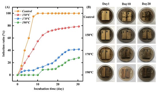 Bamboo is often attacked by fungi in outdoor applications, resulting in a serious reduction of mechanical properties and short service life. Thus, the anti-fungal property of the bamboo specimens was investigated through incubating samples with Aspergilus niger. Figure 11 shows the mildew resistance of the hydrothermally modified bamboo. Figure 11 shows that the infection ratio of the control reached 100% after only 8 days of incubation. However, after hydrothermal modification, the mildew resistance property of bamboo samples increased. In other words, thermal modification is a positive influence on the mildew-resistance property of bamboo. For example, after treatment at 190 °C, the mildew proportion of bamboo specimens remained 0% in the first 8 days, while the bamboo samples which were treated at 150 °C presented a very poor anti-fungal property in comparison to the bamboo samples (190 °C). These changes indicate that the anti-mildew property of bamboo samples positively corresponded to the treatment parameters. This is due to the decomposition of polysaccharide and starch in bamboo samples and the enhanced surface hydrophobicity. In detail, the enhanced surface hydrophobicity inhibits the bamboo samples from absorbing water, and thus effectively reduces the adhesion between Aspergilus niger and bamboo samples [35,36]. In addition, the decrement of polysaccharide and starch hinders the growth of Aspergilus niger. A schematic diagram of the thermal modification mechanism is presented in Figure 12.