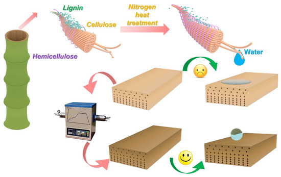 Natural six-year-old bamboo was collected from Fujian, China. Nitrogen was used as a protective gas to provide an oxygen-free environment for the heat treatment. Firstly, the moso bamboo was split and cut into bamboo strips with an average size of 100 mm × 20 mm × 6 mm (length × width × thickness). The initial density and moisture content of moso bamboo were 0.75 g/cm3 and 85%. The heat parameters were conducted at 150, 170, 190, and 210 °C for time periods of 1, 2, 3, and 4 h. A tube furnace (GSL-1700X-80-HNG, Jingmi Technology., Ltd., Shanghai, China) was used as heat treatment equipment to provide a nitrogen environment. The experimental process of sample preparation and thermal modification is shown in Figure 1.