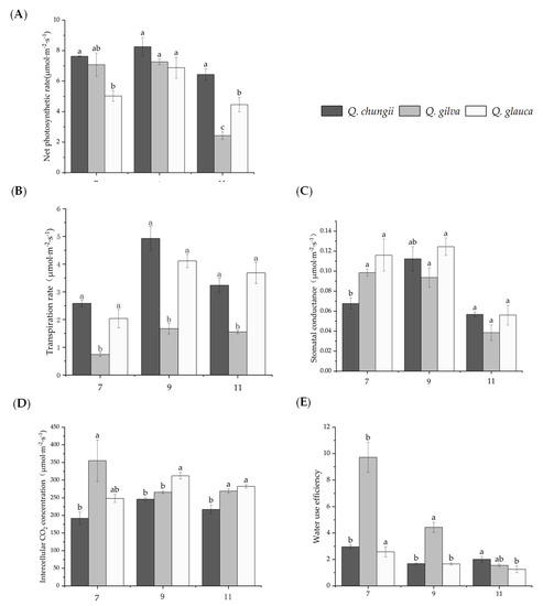 Results of changes in photosynthetic gas exchange parameters in leaves of Quercus chungii, Quercus gilva, and Quercus glauca in the three precious timber species. Data are means ± SD (n = 3). Different lowercase letters following the values indicate significant difference (p < 0.05) between species under the same month. (A) net photosynthetic rate (Pn), (B) stomatal conductance (Gi), (C) transpiration rate (Tr), (D) intercellular CO2 concentration (Ci), and (E) water use efficiency (WUE), 7, 9, and 11 represent July, September, and November, respectively.