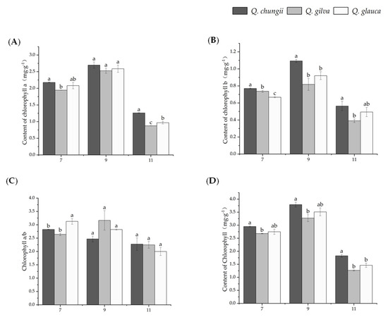 Results of change in photosynthetic pigment on leaves of the three precious timber species of Q. chungii, Q. gilva, and Q. glauca. Data are means ± SD (n = 3). Different lowercase letters following the values indicate significant difference (p < 0.05) between species under the same month. (A) chlorophyll a (Chl a), (B) chlorophyll b (Chl b), (C) chlorophyll a/b (Chl a/b), and (D) contents of chlorophyll (Chl a + b).