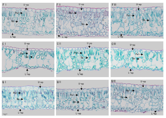 Observation of mature leaf anatomical structure characteristics of Q. chungii, Q. gilva, and Q. glauca seedlings in different months using optical microscopy (×200). U-ep, Upper-epidermis; L-ep: Lower-epidermis; Pal: Palisade; and Sp: Spongy tissue. (F) Q. chungii, Q. gilva, (Q) Q. glauca, (F) Q. chungii, (C) Q. gilva, (Q) Q. glauca, and I, II, III represent July, September, and November respectively.