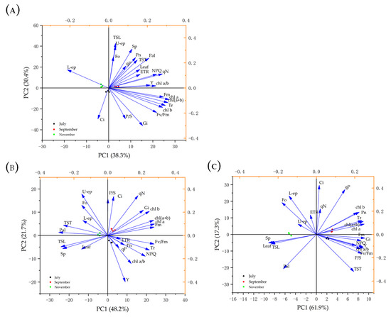 Principal component analysis (PCA) describing the responses of Q. chungi (A), Q. gilva (B), and Q. glauca (C) of photosynthetic characteristics and leaf anatomical structure parameters in July, September, and November. (Pn) net photosynthetic rate (µmol·m−2·s−1), (Tr) transpiration rate (µmol·m−2·s−1), (Gi) stomatal conductance (µmol·m−2·s−1), (Ci) intercellular CO2 concentration (µmol·m−2·s−1), (U-ep) upper-epidermis (µm), (Pal) palisade (µm), (Sp) spongy tissue (µm), (L-ep) lower-epidermis, (P/S) ratio of palisade tissue and spongy tissue, (leaf) leaf thickness (µm), (TST) cell tense ratio, (TSL) spongy tissue looseness, (Chl (a + b)) the total of Chlorophyll (mg·g−1), (Chl a) Chlorophyll a (mg·g−1), (Chl b) Chlorophyll b (mg·g−1), (Chl a/b) Chlorophyll a/b, and Chlorophyll fluorescence parameters (Fo, Fv/Fm, ETR, qP, Y, and NPQ).