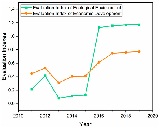 Change trends in the evaluation index of the environment and economic development from 2011 to 2019.