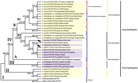 The combined majority-rule consensus tree results from ML analysis and optimal tree results from Bayesian analysis generated from the ITS sequence dataset. Number below branches are bootstrap percentages ≥ 50 and probability values ≥ 0.5 (BS/PP). Clade II–IV shows the ingroups of genus Spathoglottis; Clade I indicates outgroup. Clade II and III holds the Dwarf Spathoglottis species, while Clade IV (A and B) consists of the Large Spathoglottis species. Clade B is further separated into subclades B1 and B2; each holds the Large Purple and Large Yellow Spathoglottis species group, respectively. Taxa highlighted in yellow box are the yellow flower Spathoglottis while purple box comprises of flowers in different shades of purple. Groupings of taxa were also based on the shape of the labellum; either narrow or broad/bilobulate.