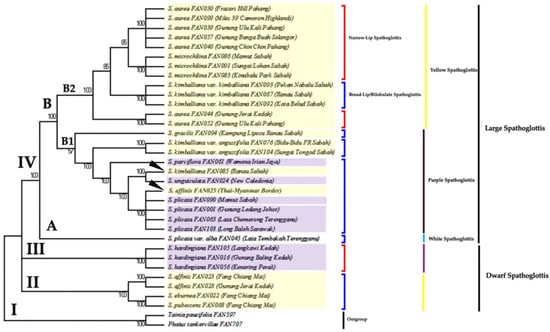 Clade IV is monophyletic with strong (BS) and (PP) supports (BSML = 98%, PPB= 1.0), and was further divided into two subclades according to the colour of the flowers. Subclade IV-A (BSML = 100%, PPB = 1.0) consists of all the Large Purple Spathoglottis species and is polyphyletic; due to the placements of the two yellow-flower Spathoglottis (S. kimballiana_FAN085 and S. affinis_FAN025) within this clade. Eventhough S. kimballiana has distinct morphological attributes and is geographically isolated from S. unguiculata, this two species were connected by having more than four leaves per plant and possessed tough coriaceous sepals; characteristics unique to this two species.