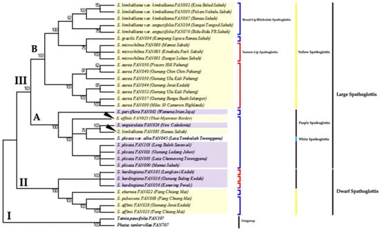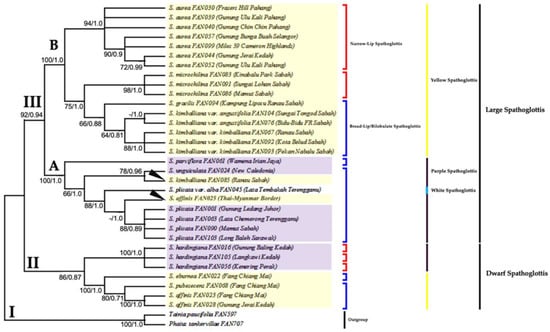 The combined majority-rule consensus tree results from ML analysis and optimal tree results from Bayesian analysis generated from the combined plastid gene dataset. Number below branches are bootstrap percentages ≥ 50 and probability values ≥ 0.5 (BS/PP). Clade II and III holds all 11 species and three infraspecific taxa (ingroups) of Spathoglottis; Clade I indicates outgroup. Clade II comprises of the Dwarf Spathoglottis species, while Clade III consists of the Large Spathoglottis species. Clade III is further separated into subclades A and B; the Large Purple and Large Yellow Spathoglottis groups, respectively. Groupings of taxa were also based on the shape of the labellum; either narrow or broad/bilobulate. Both clades of Dwarf and Large Spathoglottis (Clade II and Clade III) are monophyletic.