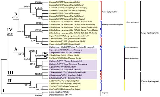The combined majority-rule consensus tree results from ML analysis and optimal tree results from Bayesian analysis generated from the combined plastid and nuclear gene dataset. Number below branches are bootstrap percentages ≥ 50 and probability values ≥ 0.5 (BS/PP). Clade II–IV holds all ingroups of genus Spathoglottis; Clade I indicates outgroup. The Dwarf Yellow Spathoglottis (Clade II) formed a basal group; while the Dwarf Purple Spathoglottis (Clade III) is sister to all Large Spathoglottis species. Clade IV that comprises of the Large Spathoglottis groups is monophyletic. Independently, the Large Yellow Spathoglottis group (Subclade IV-B) is monophyletic while the Large Purple Spathoglottis group (Subclade IV-A) is polyphyletic.