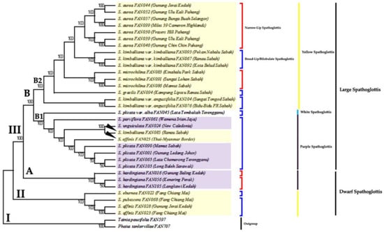 Meanwhile, subclade III-B (Large Yellow Spathoglottis group) is monophyletic, and the clade is fully supported by strong (BS) and (PP) values (BSML = 100%, BSMP = 100%, PPB = 1.0). The yellow-flower species within this clade is further divided into two subgroups based on their geographical distribution and geological history. The S. aurea clade is strongly-supported with BSML = 94%, BSMP = 100%, and PPB = 1.0. Spathoglottis aurea is then further grouped according to their pollination strategies; between the cleistogamous flower group (BSML = 93%, BSMP = 87%, PPB = 1.0) and the geitonogamous flower group (BSML = 90%, BSMP = 100%, PPB = 0.9). For the Bornean Spathoglottis clade (BSML = 75%, BSMP = 100%, PPB = 1.0), it is very obvious that S. gracilis and S. microchilina that possessed broad-plicate leaf were separated from the two narrow-grassy leaf infraspecies, S. kimballiana var. angustifolia and S. kimballiana var. kimballiana. In the MP tree, S. gracilis was observed to be genetically close to the narrow-lip S. microchilina (BSMP = 75%), but is sister to S. kimballiana var. kimballiana and S. kimballiana var. angustifolia in the ML and Bayesian tree (BSMP = 66%), PPB = 0.8).