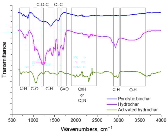 The spectra of all three analyzed carbonaceous materials show peaks in the band 3700 to 3000 cm−1 assigned to (O-H) groups present in aliphatic and phenolic structures. At 2950 to 2850 cm−1 have identified the vibrations of (C-H) bounds from aromatic methoxy, methyl and methylene groups [57]. The peaks between 2000–2600 cm−1 could indicate the possible presence of the (C-N) or (CC) triple bond. Descending below 2000 cm−1, all peaks recorded for Hc have a higher intensity than those registered for PBc and AcHc spectra. This can probably be explained by the fact that Hc resulted directly from the feedstock conversion as a result of hydrolysis, dehydration, decarboxylation, aromatization, and recondensation reactions which generally occur during hydrothermal conversion. Subsequently, with the thermal activation of the hydrochar, more dehydration and decarboxylation reactions occur, and the double bonds (C=O) and (C=C) are probably transformed into simple bonds such as carboxyl and hydroxyl groups [58].