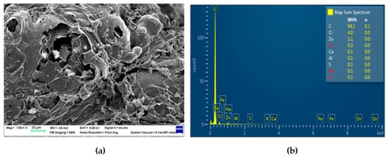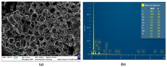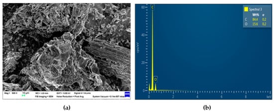 The surface morphology of PBc, Hc, and AcHc was analyzed using SEM images, and elemental levels were estimated based on the EDX spectra alongside elemental mapping, as shown in Figure 2, Figure 3 and Figure 4. The images revealed a hierarchical porous structure resembling a cellular structure for all three types of chars. This porous network could facilitate the diffusion of lead ions to the interior of adsorbents by creating a larger contact surface and increasing the binding sites for lead.
