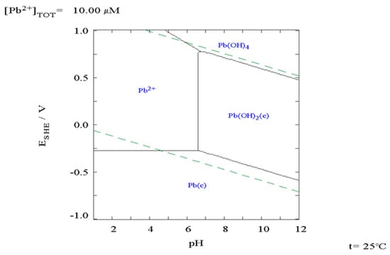 Lead speciation in aqueous solutions is mostly controlled by pH and redox potential (Eh). Lead Eh–pH diagrams are well documented and easily found in the literature [60,61]. The Pourbaix (or potential/Ph) diagram, which schematically presents the lead speciation in water according to effluent pH, is shown in Figure 5. Until pH around 7, typically found in natural environments, Pb2+ is expected to be dominant in an aqueous solution. The zone between the dotted lines represents the stability zone of water.