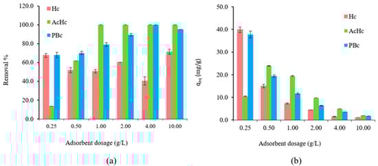 Removal efficiency (a) and adsorbed amount (b) (±global uncertainty) by PBc, Hc, and AcHc at different adsorbent concentrations, C0 = 20 mg/L Pb(II), pH = 5 ± 0.5, T = 23 ± 1 °C, 4 h contact time.