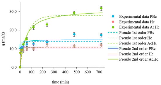 Kinetics for Pb (II) biosorption on PBc, Hc, and AcHc (values ± global uncertainty) at C0 = 20 mg/L Pb(II), Cs = 0.5 g/L biochar dosage, T = 23 ± 1 °C: experimental data and pseudo-first (1st) and pseudo-second (2nd) order model.