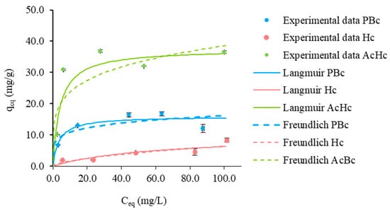 The equilibrium study provides information on the affinity of the bio-based materials to the adsorbate and indicates the maximum adsorption capacity that could be expected for the adsorbent. The sorption isotherms for the uptake of Pb(II) by carbonaceous materials were determined at pH 5 ± 0.5, using a char’s initial concentration of 0.5 g/L (accurately weighed for each sample). The initial lead concentration ranged between 7.5 and 100 mg/L. This range of concentrations was chosen based on data reported for the electroplating industry (0.7–25 mg/L), for the mines drainage waters (about 6 mg/L) [37], for battery manufacturing or recycling industries (5–15 mg/L) [36] as well as for wastewater monitoring (40.8 to 319.4 mg/L) [47]. Equilibrium studies were performed in Erlenmeyer flasks using a 25 mL volume of lead solution. Following the kinetics study results, a time of 6 h was considered to ensure that equilibrium was reached for each concentration tested. The residual lead concentration (Cf) was determined by AAS, and the amount of Pb adsorbed per char mass unity (q) was calculated using Equation (1). Although, in this case, Cf corresponds to the equilibrium lead concentration (Ce) and q to the equilibrium absorbed quantity (qe).