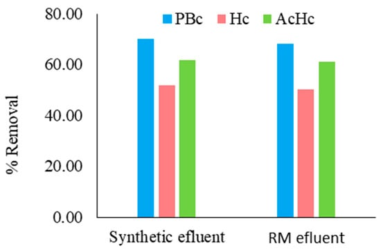 The removal efficiency of lead on synthetic effluent and Rosia Montana mine drainage water (RM), C0 = 20 mg/L Pb(II), Cs = 0.5 g/L char, T = 23 ± 1 °C, 4 h contact time.