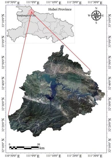 The research area (Figure 1) is located in the Longkou Forestry Station (110°11′E–111°12′E, 32°40′N–32°41′N), Danjiangkou City, Hubei Province, covering an area of 5045.66 ha. Located in the source area of the middle line of the South-to-North Water Diversion Project, it belongs to the subtropical monsoon climate zone, with a warm climate, abundant precipitation, the same period of rain and heat, sufficient sunlight, and four distinct seasons. The average annual temperature is 15.9 °C, the average annual sunshine is 2009.5–2059.7 h, the average relative humidity is 71%, the frost-free period is 180–250 days, and the average annual precipitation is 750–900 mm, with the least rainfall in January and the most from July to September. The soil is mainly composed of yellow soil and yellow brown soil, the soil layer is thin and barren, and the erosion is serious. The forests in the reservoir area are mainly plantation forests and secondary forests. Tree layers include Pinus massoniana, Quercus variabilis, Cupressus funebris; the understory shrub layer includes Rhus chinensis, Zanthoxylum bungeanum, Ziziphus jujuba, Sophora davidii, etc. Herb layers include Ophiopogon bodinieri, Imperata cylindrica, Trachelospermum jasminoides, Oxalis corniculata, etc.