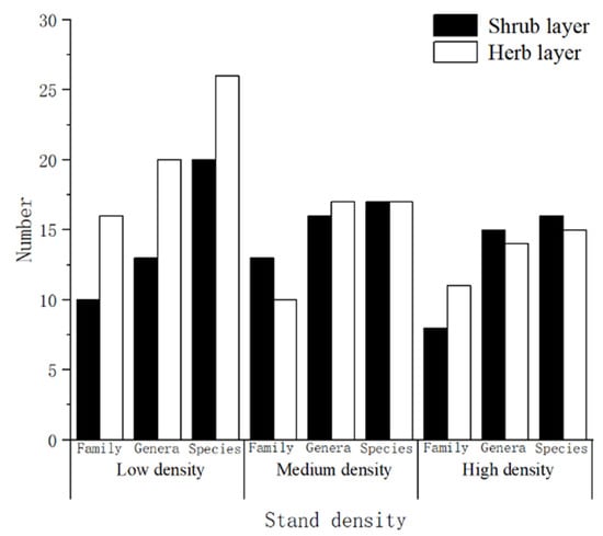 In this study, with the increase in the stand density, the species diversity decreased gradually, and the species richness and Shannon–Wiener diversity index of the shrub layer also decreased with the increase in the stand density. The diversity of shrub vegetation was also different among the three densities, indicating that the understory vegetation composition is sensitive to the change in the canopy density and microenvironment, which is consistent with the research results of many scholars [34]. The research results of Lu et al. [35] showed that the stand density will limit the species and quantity of undergrowth plants by changing the soil, temperature, and light intensity in the forest and the distribution of soil nutrient elements in the forest. With the increase in stand density, the amount of light penetrating through the forest decreases, which affects the decomposition of litter [35] and there is insufficient light in the forest, which directly leads to the decrease in soil fertility, thus resulting in the decrease in the species diversity of the understory plants. Unlike herb plants, the species richness of shrubs increased slightly with the increase in stand density, indicating that the survival ability of shrubs in high-density stands is obviously better than that of dwarf grasses, indicating that with the increase in the stand density, the canopy density increased, and the competition for resource space of the tree layer species intensified, which inhibited the survival of the understory vegetation species. In the long succession process, some species without competitive advantage are gradually eliminated.